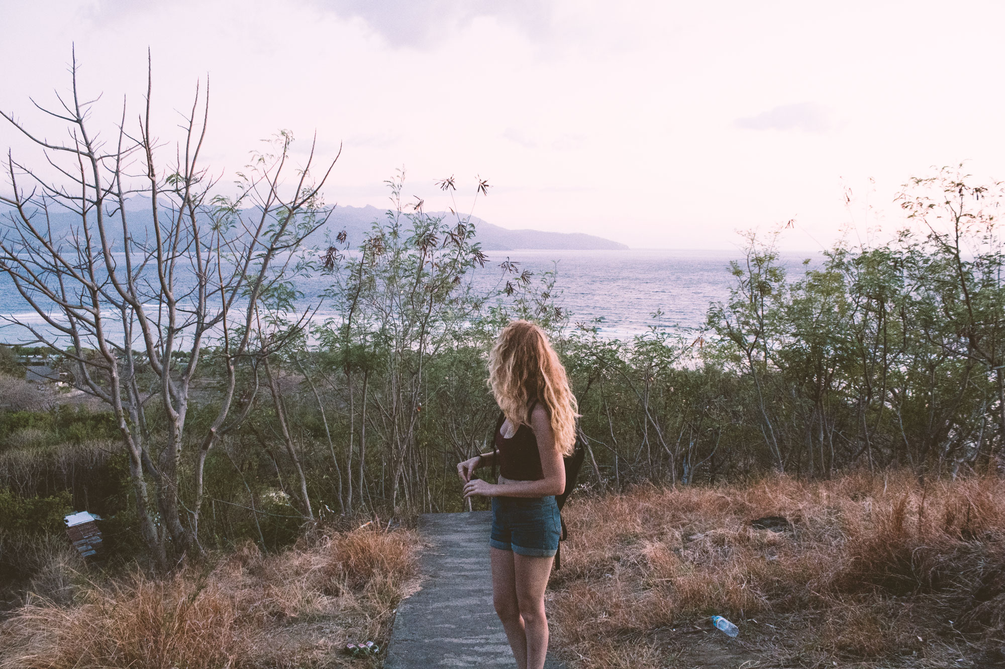 It was marked as ‘Gili T Viewpoint’ on our hostels’ hand drawn map, and with a rough idea of where to go, we walked through the backstreets of chickens, cats and cooking food, dodging sand puddles and tourists on bikes. The sun was getting closer to setting with each minute, and we were glad to find the obscure stairway, as it disappeared behind houses and into the trees.