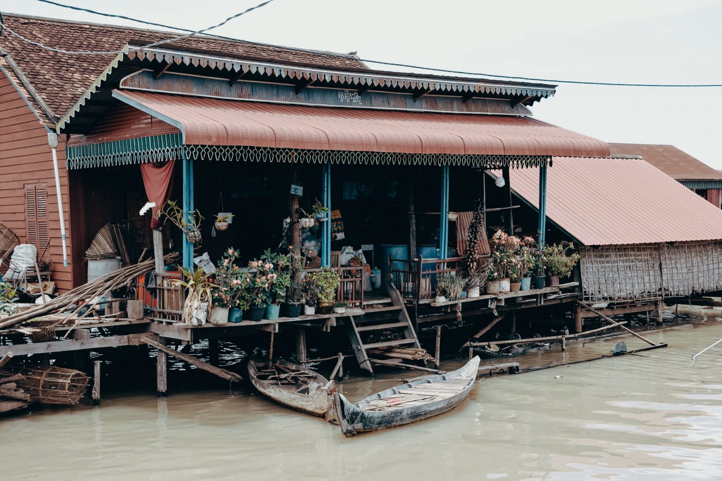 The lake stretches far away into the distant horizon. We’re here in the rainy season, so the lake is full and the rivers are bloated with water. During this time, locals get around purely by boat, travelling by water to the shop, to school and to the neighbour’s house. Thanks to the heavy rainfall, the lake is a chocolate brown, dotted with leaves and branches from the nearby mangrove forests. The sound of diesel engines drowns out any kind of peace you might be thinking exists here. Despite being on a lake, life here is very much like it is everywhere else – loud and messy and colourful and vibrant. The houses are built from corrugated iron and wood, raised up on stilts. Plants grow wild on doorways and kids jump off their front porch into the water. Life here is simple but enriching.