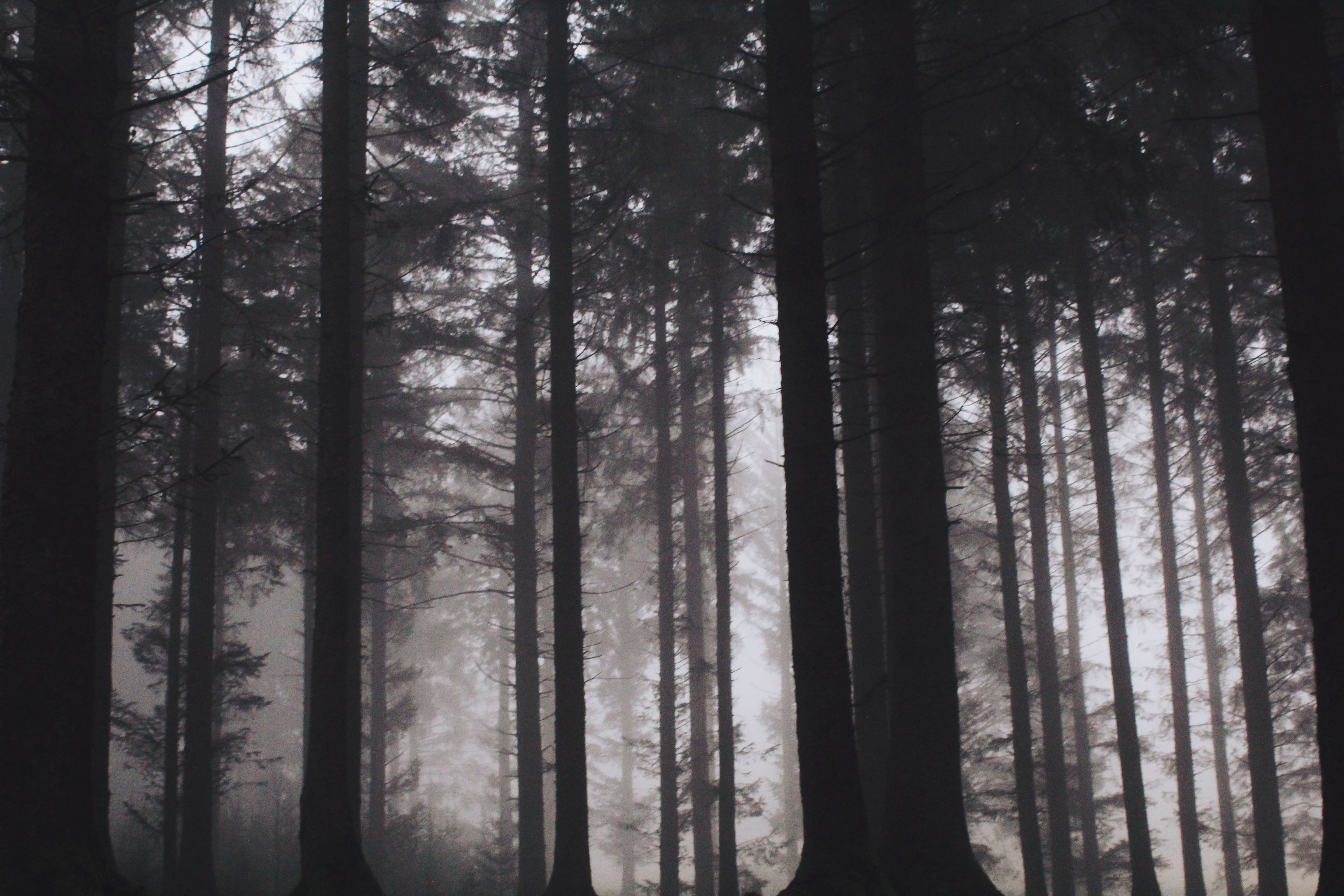 Dark, misty pine trees at Bellever Forest, Dartmoor